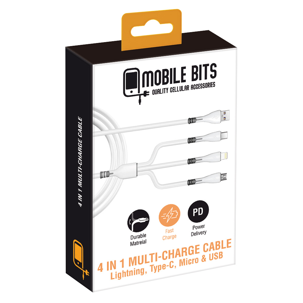 One cable. All your devices. The Mobile Bits Retail 4-in-1 Multi-Charge Cable is your all-in-one solution for fast, reliable charging across multiple platforms. Featuring USB to Micro USB, Lightning, and Type-C connectors, this compact 1-meter cable supports Power Delivery (PD) and up to 65W fast charging—making it perfect for smartphones, tablets, and accessories. With durable construction and 5,000+ bend resistance, it’s designed for daily use at home, work, or on the go.