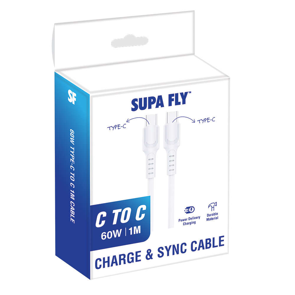 Power up quickly and reliably with the Supa Fly Mass Type-C to Type-C Cable. Designed for high-speed charging and data transfer, this 1-meter cable supports 60W Power Delivery, making it perfect for smartphones, tablets, and compatible laptops. With over 8,000 bend resistance, it’s built to withstand daily use while staying compact, lightweight, and travel-ready.