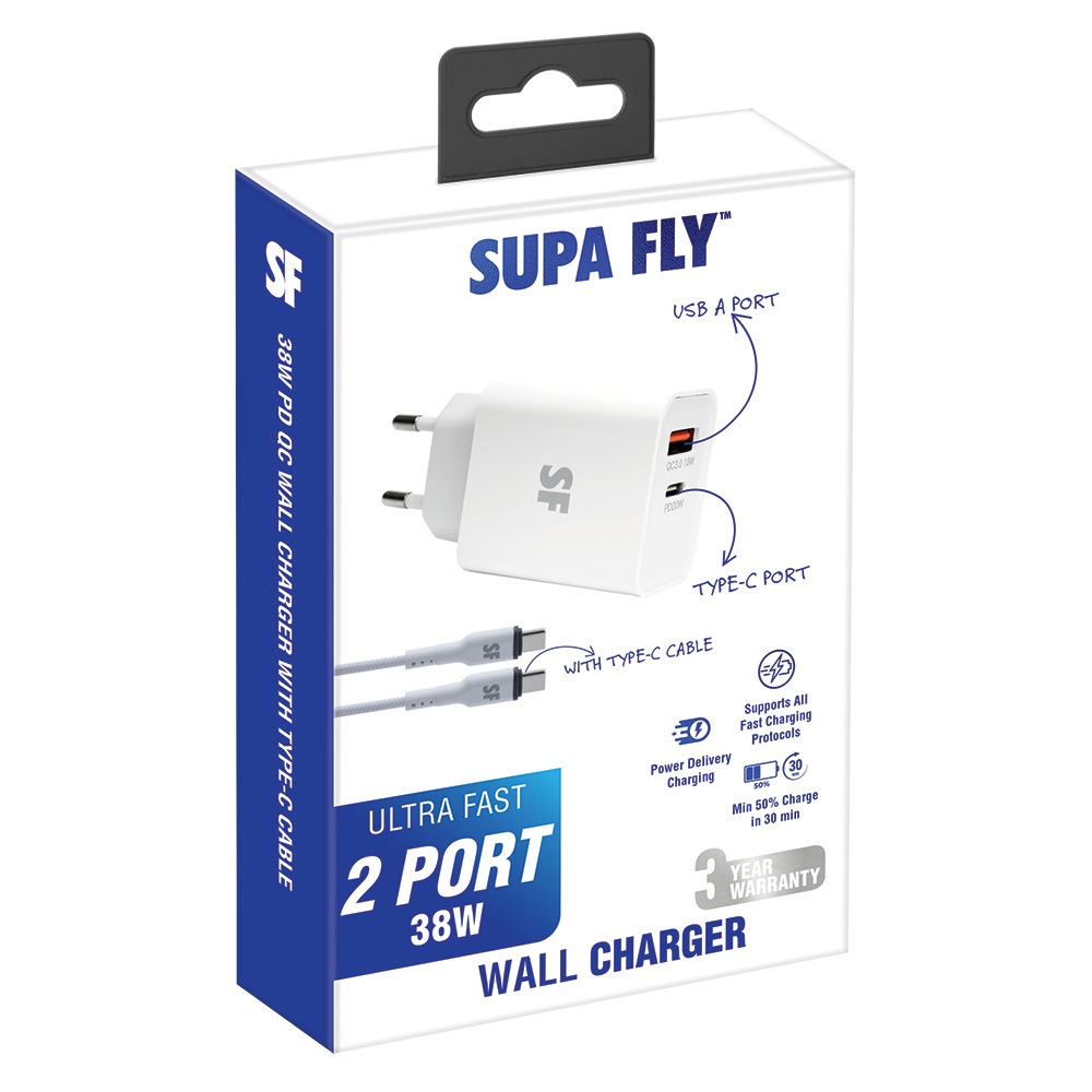 Power up fast with the Mobile Bits 38W Dual Port Wall Charger, bundled with a durable Type-C to Type-C cable. Featuring both a 20W USB-C Power Delivery port and an 18W USB-A Quick Charge port, this compact charger delivers a total output of 38W—ideal for smartphones, tablets, and other high-power devices. The included 1.2m cable supports up to 38W charging and is built to withstand over 10,000 bends, making it perfect for daily use or travel.